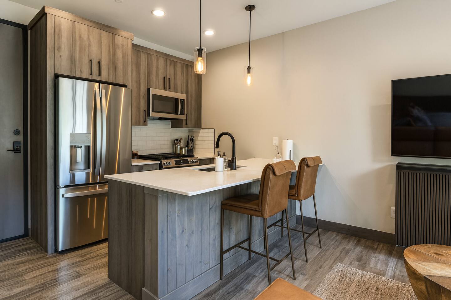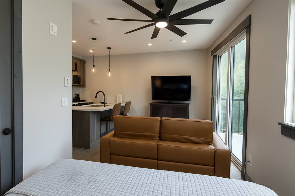 Modern studio with King bed, kitchen, and TV. Located directly across from Purgatory Resort with ski shuttle access at the door. Enjoy resort amenities including heated pool, hot tub & gym. Ideal for solo travelers or couples seeking a cozy retreat with luxury touches and a balcony boasting stunning views of the slopes and mountains.